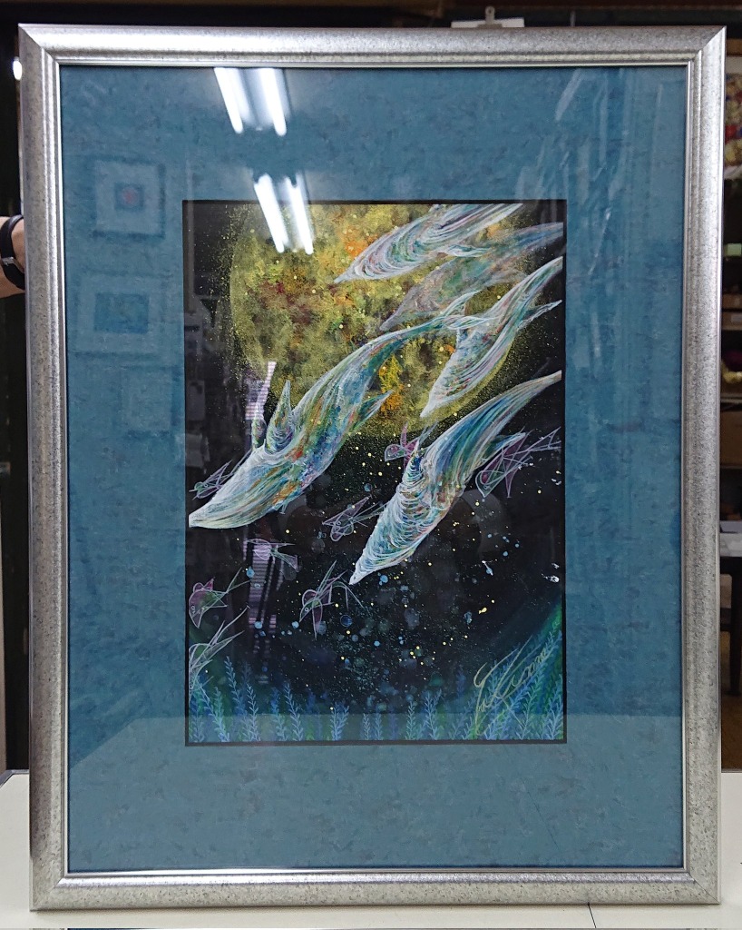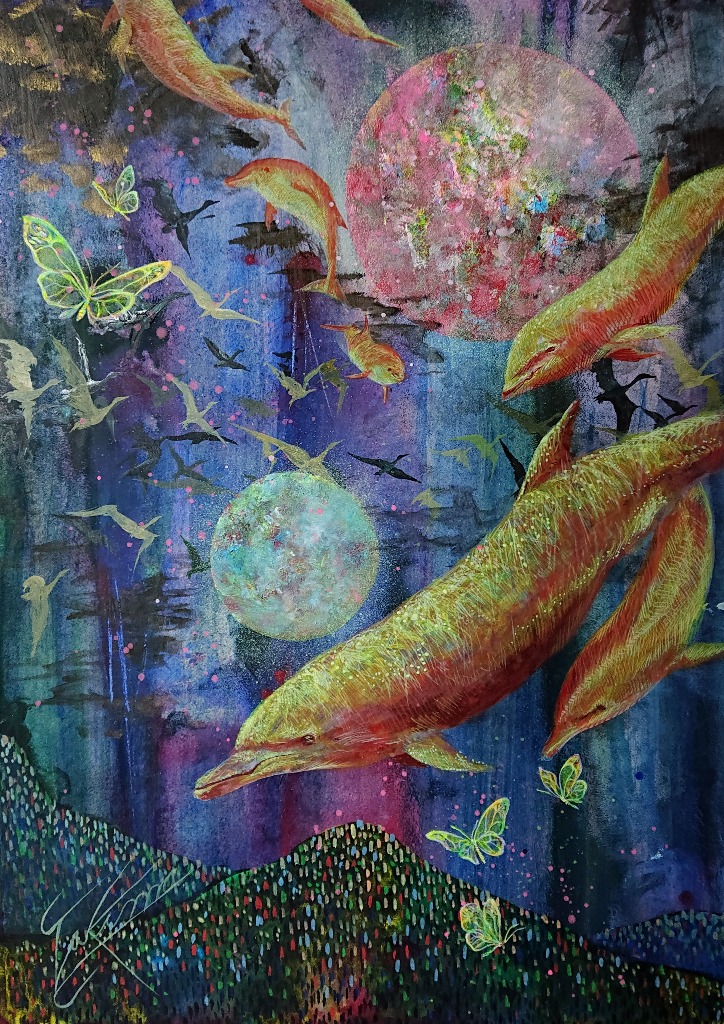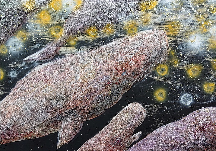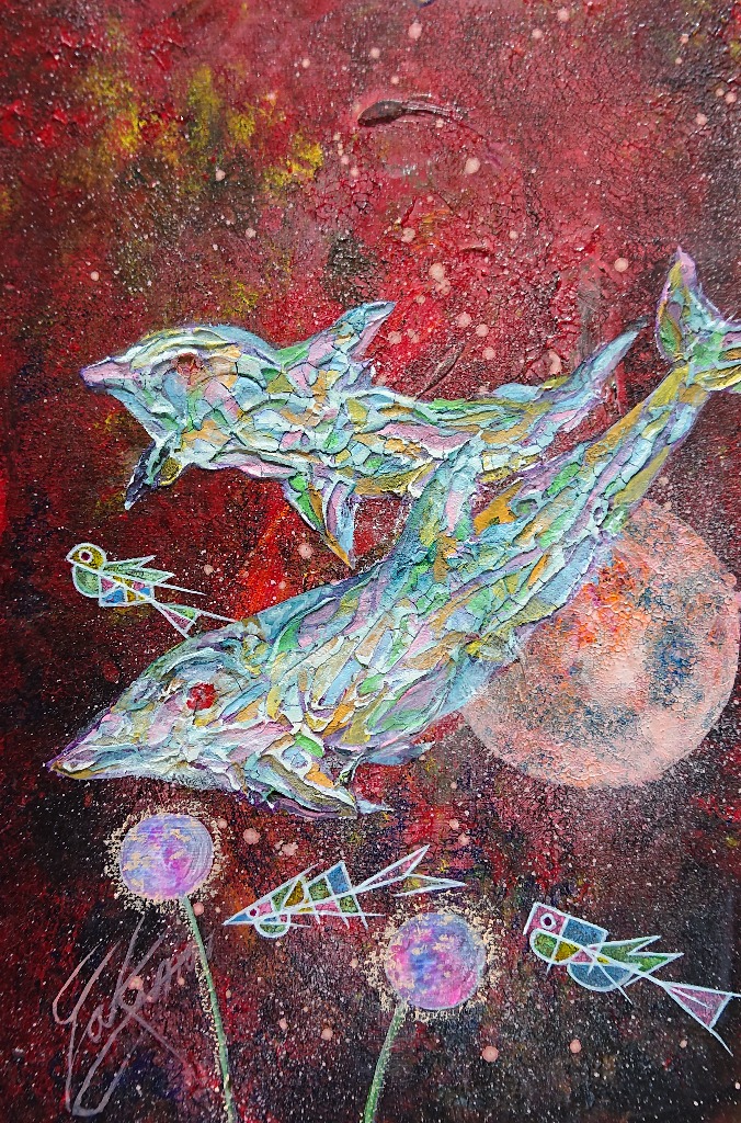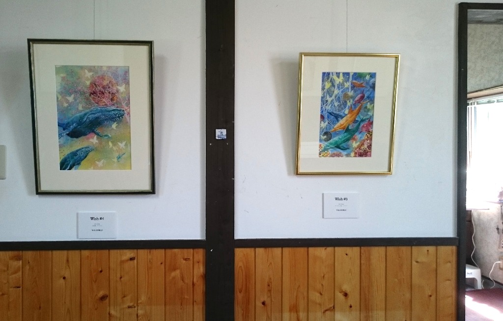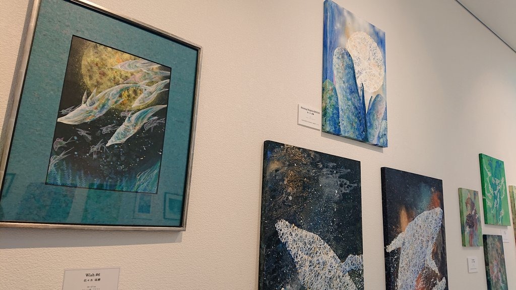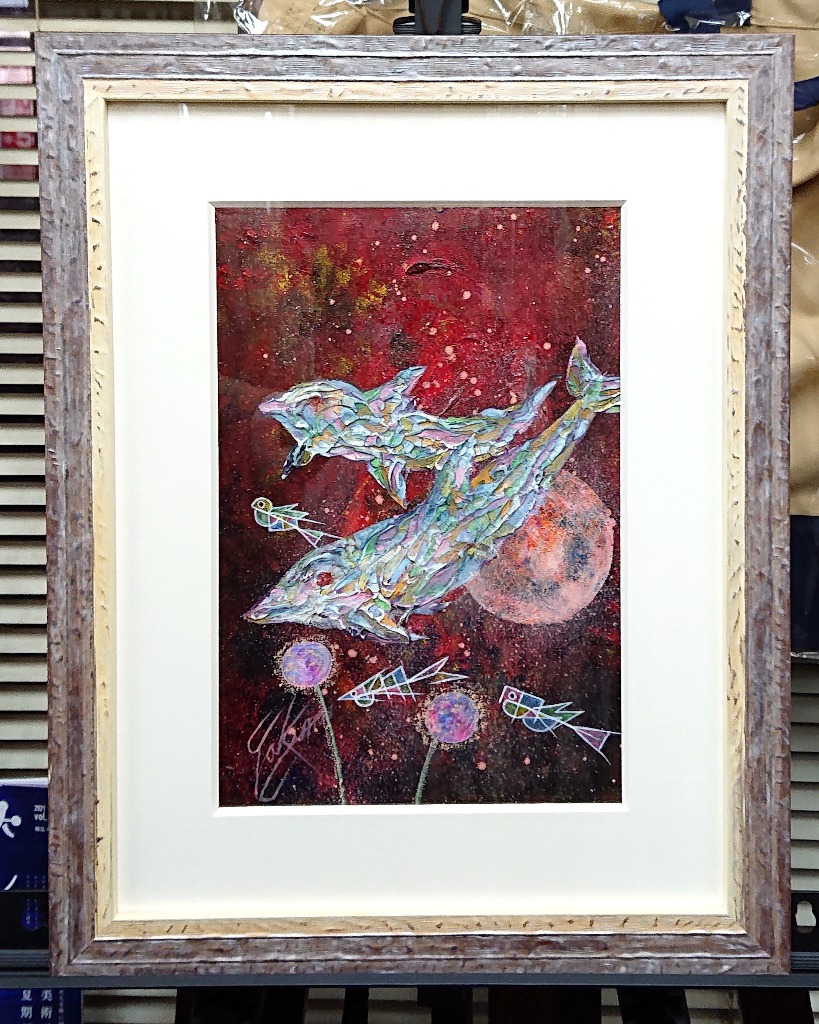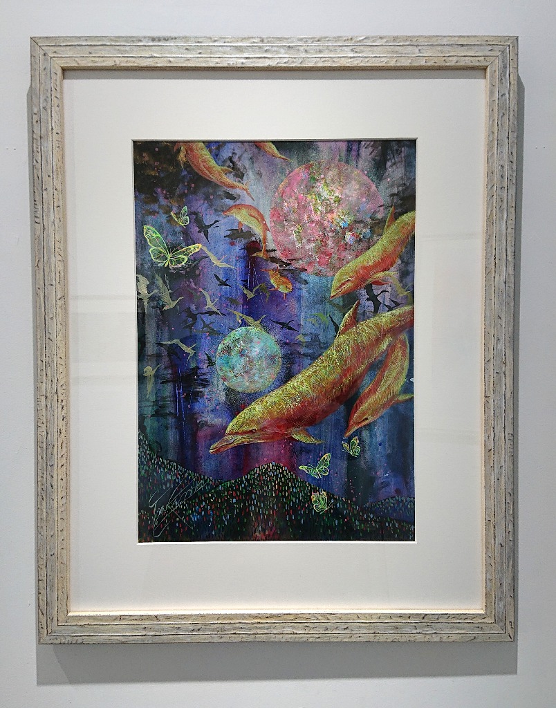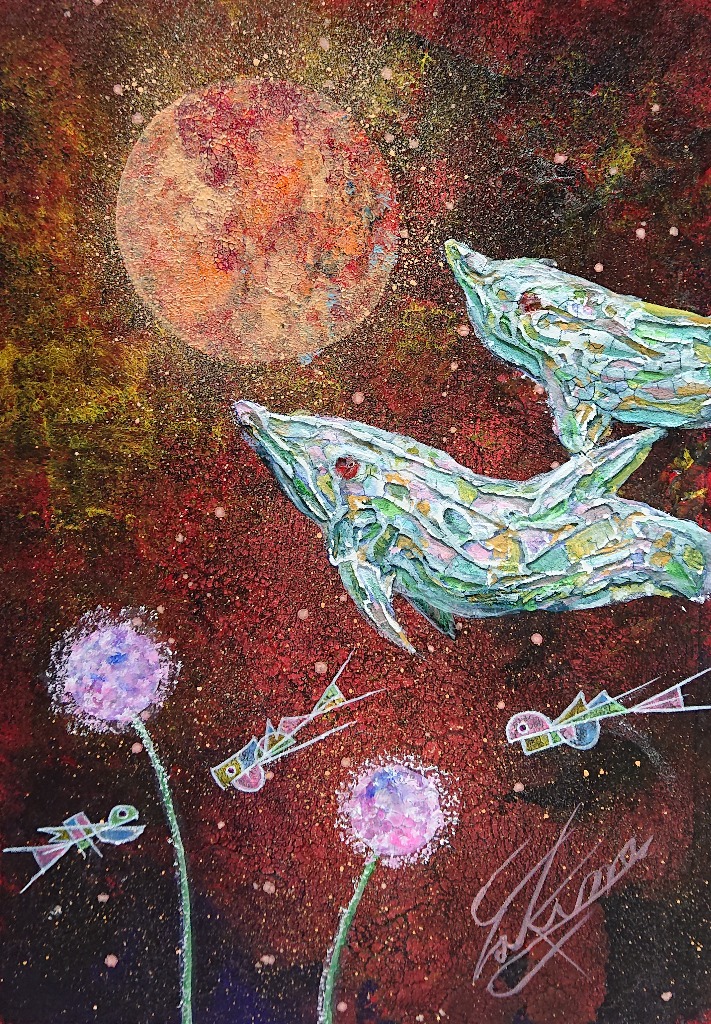 元々沿岸部育ちということもあり、海には関心がありました。創作活動を始めた頃から、鯨をメインテーマにしていたのですが、Wishシリーズは、そのときそのときの、メインワークに向けての実験や表現を確定するための大切な試作品であり、表現や思考の変化も終える非常に重要な検証結果の1つと言えます。実験と言いつつも、その実は、小作品というサイズの違いだけで、込められた精神性は大作にも負けていません。むしろ小さいサイズならではの構成や質感を目指しており、Wishシリーズとして独立した魅力や楽しみ方が成り立っています。ところで、「Wish」とは希望のことですが、総じてイルカや鯨が(海では無い)異世界を泳いでいます。これが登場する生物の希望なのか、それとも人類の勝手な希望なのかは、見る者の感じ方次第なのでしょう。