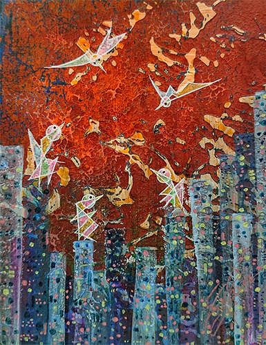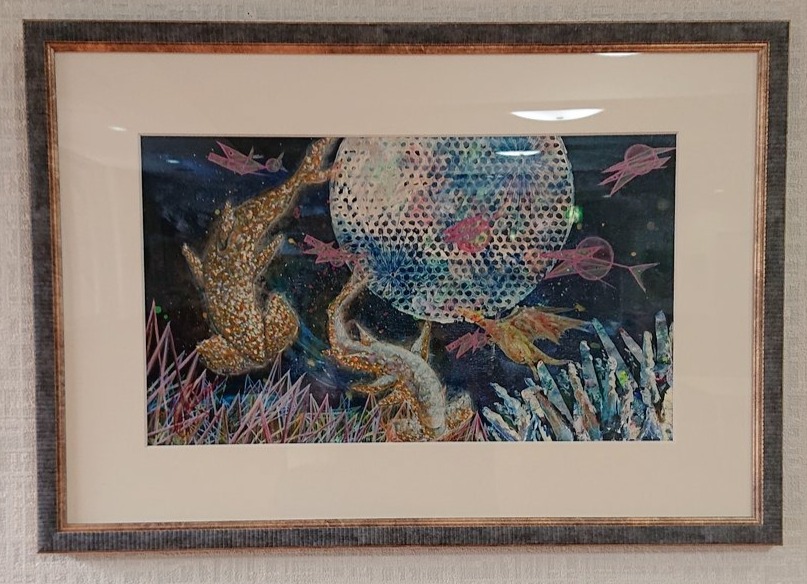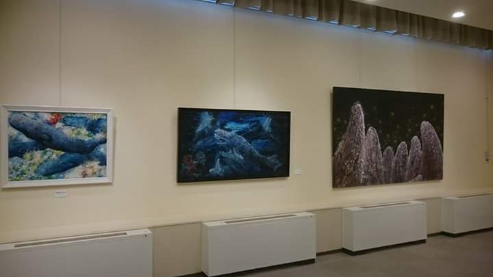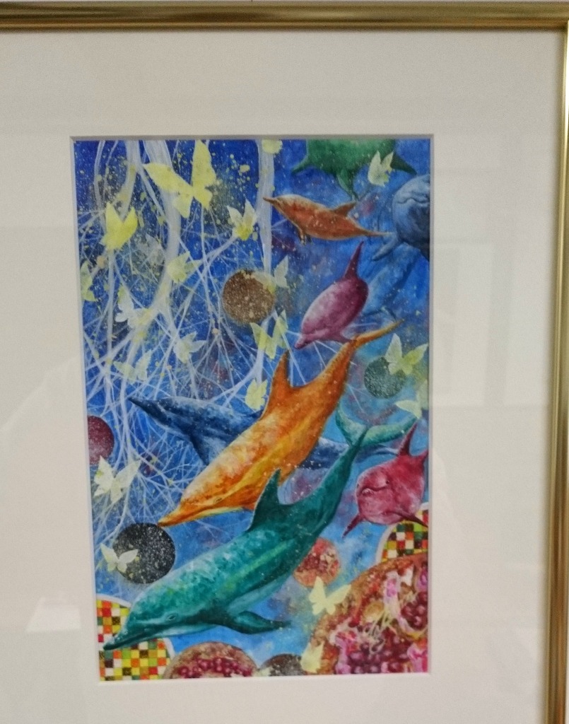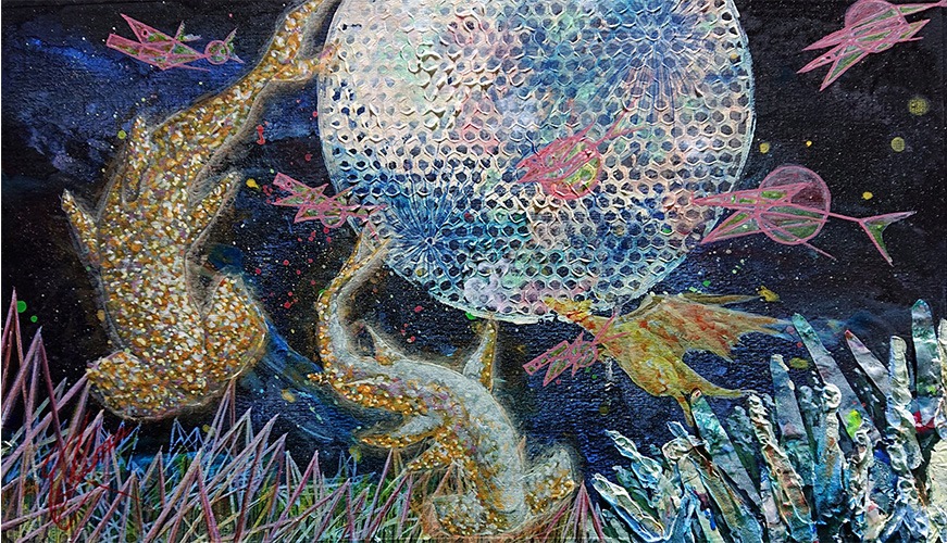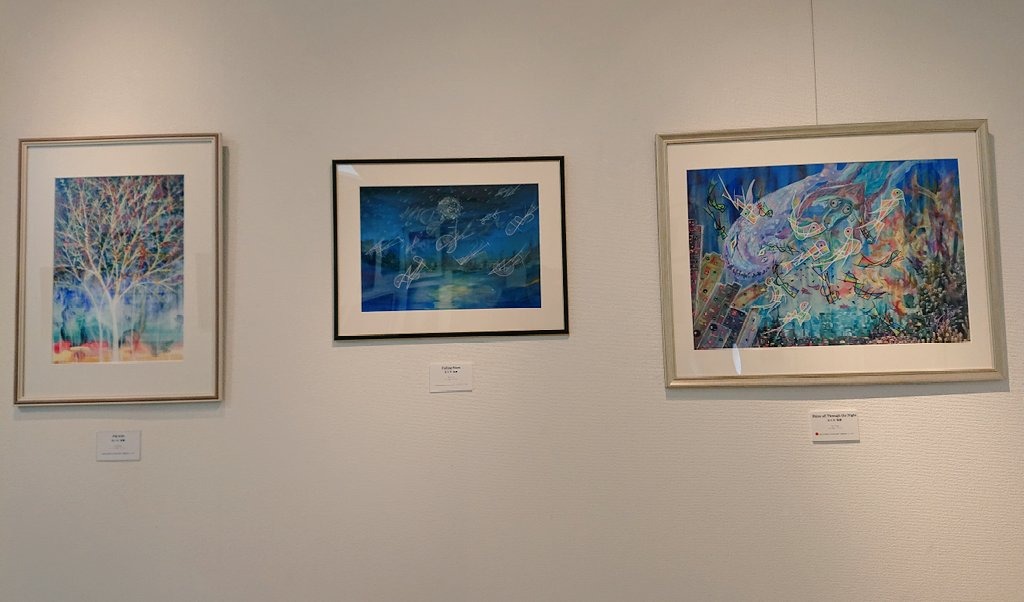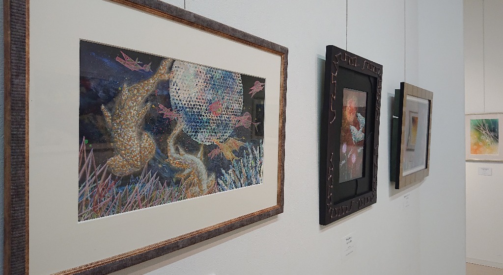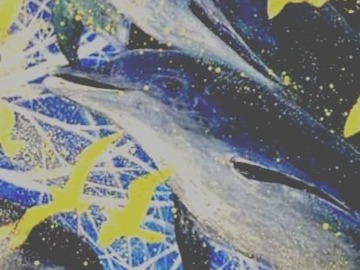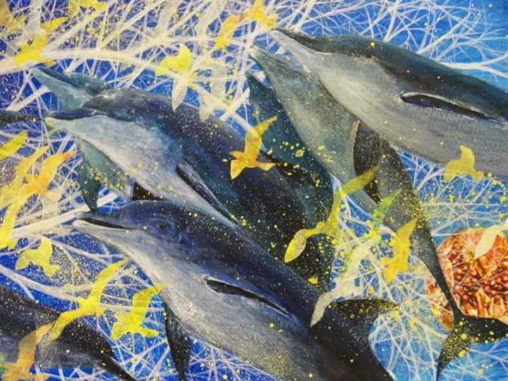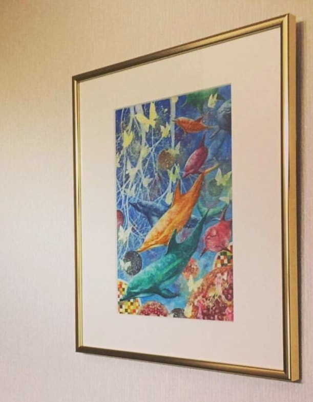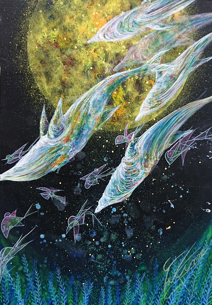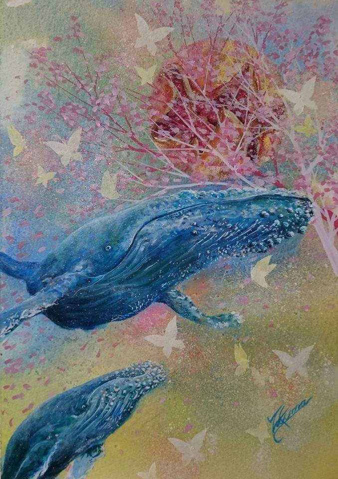 元々沿岸部育ちということもあり、海には関心がありました。創作活動を始めた頃から、鯨をメインテーマにしていたのですが、Wishシリーズは、そのときそのときの、メインワークに向けての実験や表現を確定するための大切な試作品であり、表現や思考の変化も終える非常に重要な検証結果の1つと言えます。実験と言いつつも、その実は、小作品というサイズの違いだけで、込められた精神性は大作にも負けていません。むしろ小さいサイズならではの構成や質感を目指しており、Wishシリーズとして独立した魅力や楽しみ方が成り立っています。ところで、「Wish」とは希望のことですが、総じてイルカや鯨が(海では無い)異世界を泳いでいます。これが登場する生物の希望なのか、それとも人類の勝手な希望なのかは、見る者の感じ方次第なのでしょう。