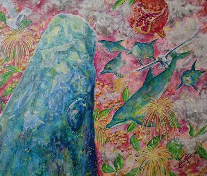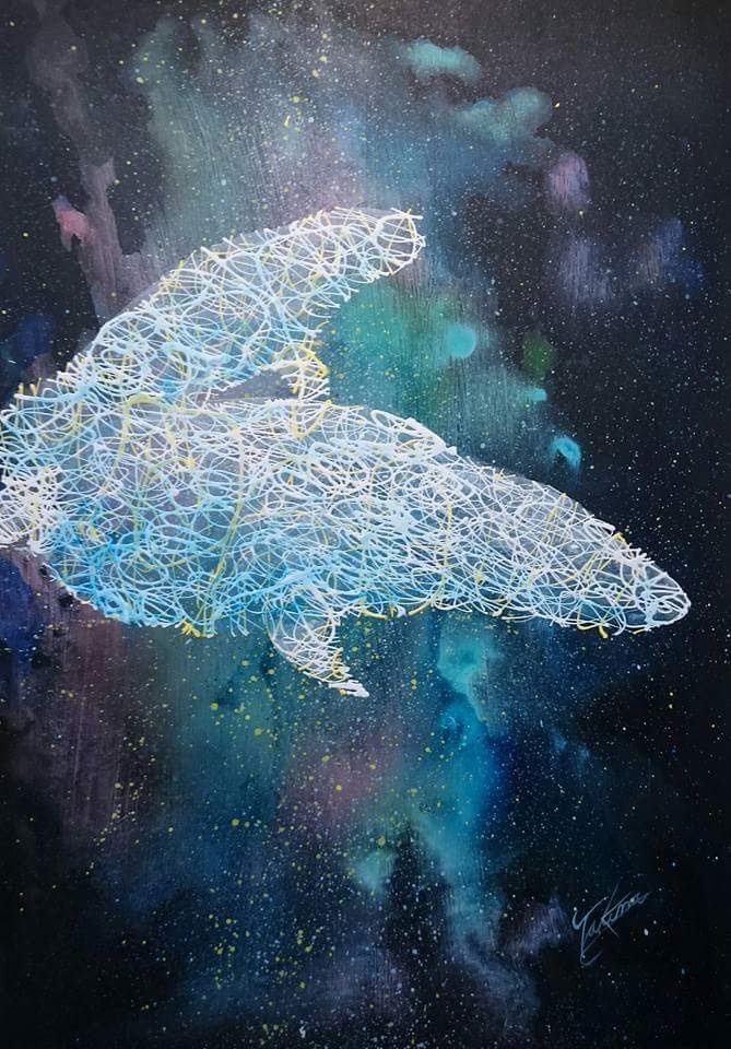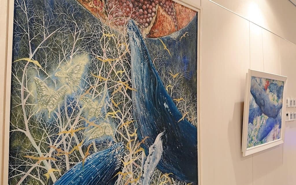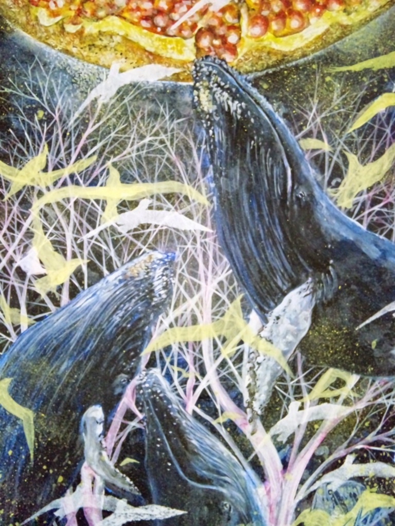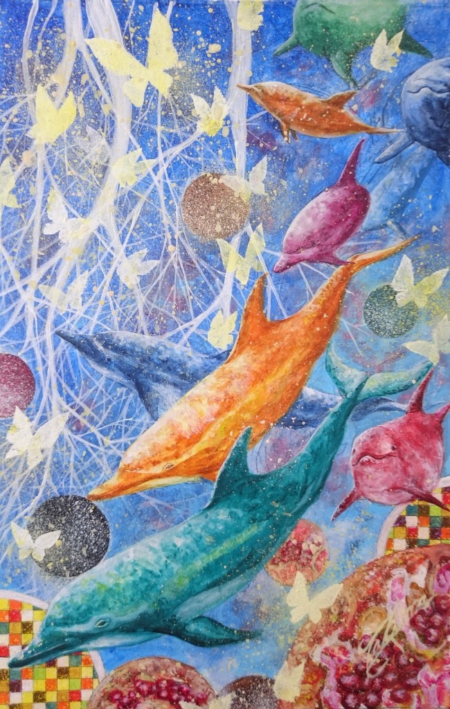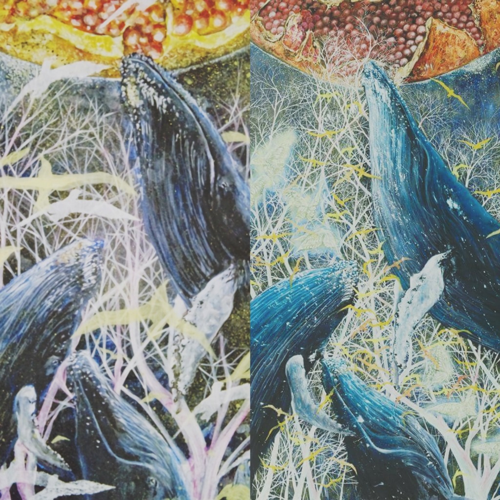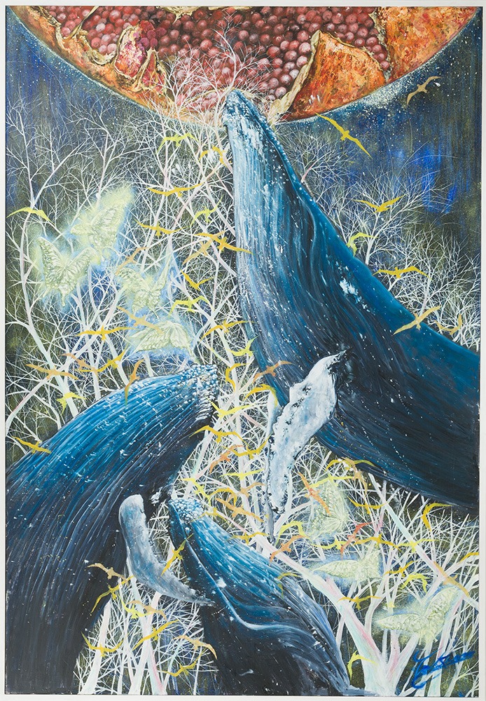 幼少の頃から、鯨には憧れがありました。優しく雄大なイメージだけでなく、ときには雌を取り合い荒ぶる猛々しさもあり。色々な意味でスケールの大きさを感じるのが、自分には魅力的だったのでしょう。また、岩手にも捕鯨文化があったことも、関連はあると思います。柘榴も、小さい頃から好きだった植物です。割れて中の赤い粒が見える様は、とても鮮烈で、どこか耽美に思えたのです。年月を重ねるに従い、鯨や柘榴、その他モチーフの意味等も知るようになりました。鯨の大作シリーズには、そう言った情報から得たインスピレーションも取り入れ、独自性を強めようとした痕跡が見られるように思います。そして、《Endless Sky》で一旦はまとめとし、次のレベルを目指し龍へと繋がるのです。