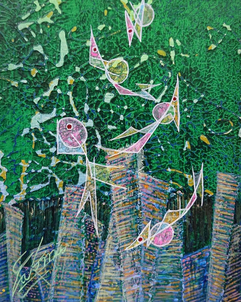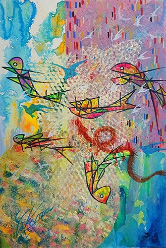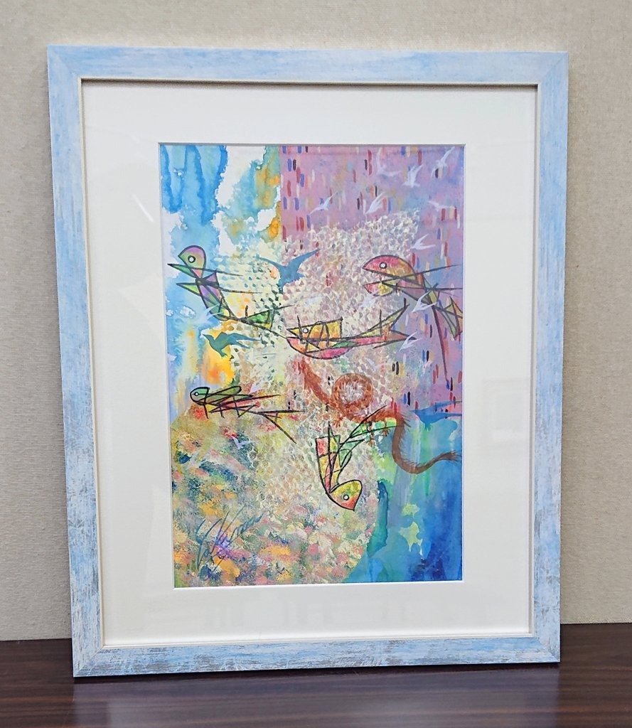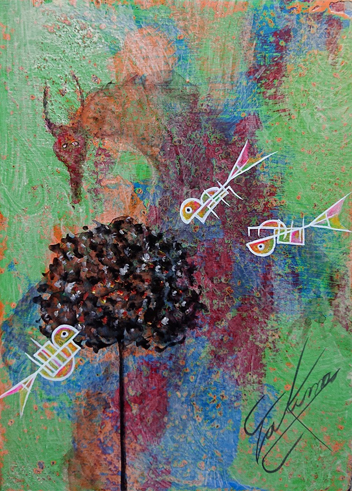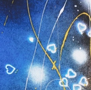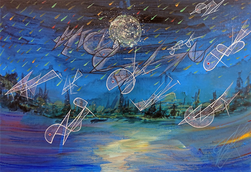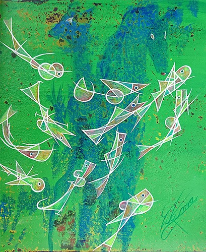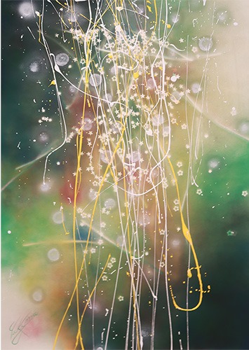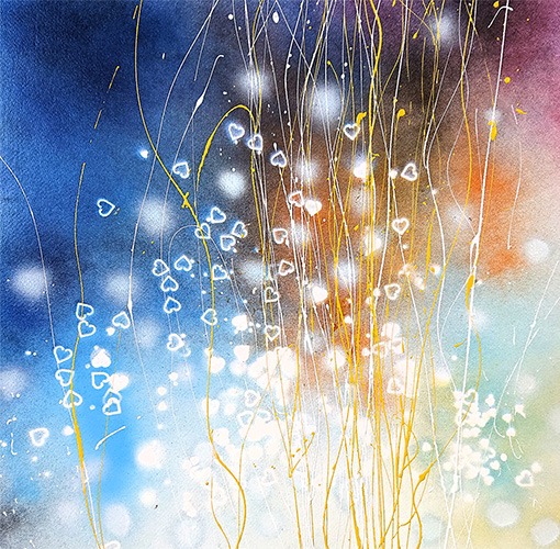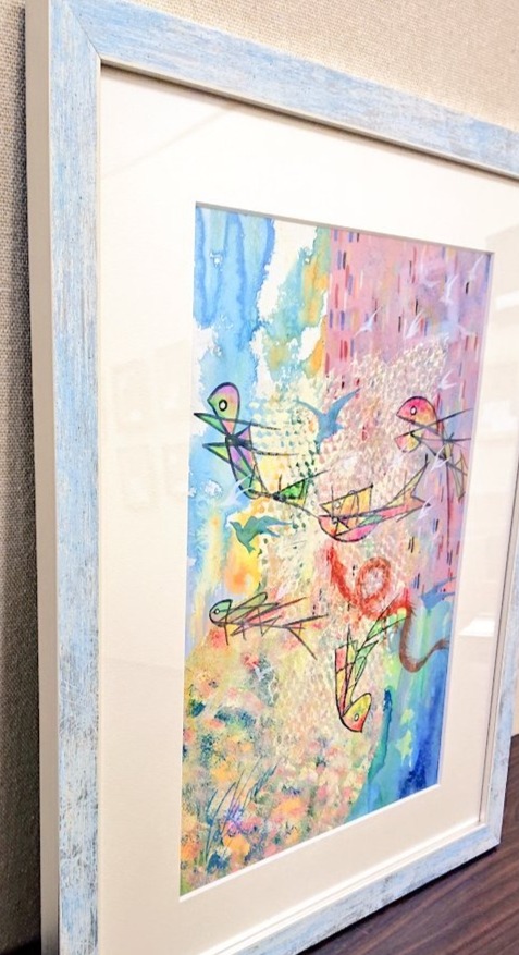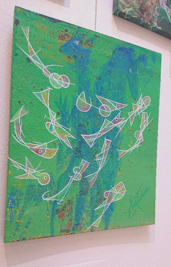抽象画を描くにあたり、何かを基に抽出や再構築をするのですが、魚から魚、花から花…等の流れだと、どうしても元のイメージに引っ張られてしまうため、「全く別の物から作るのはどうか」と思い立ったのが、言葉でした。例えば、《dreamin'》の場合は「DREAM」という単語から作るわけですが、そういう縛りがあった方が、かえって自由でリズミカルな形を作りやすいように思えたのです。つまり、この絵は「文字を伝える」ことが目的では無く、あくまで絵画としてのリズムや新鮮さを追求した結果なのです。
