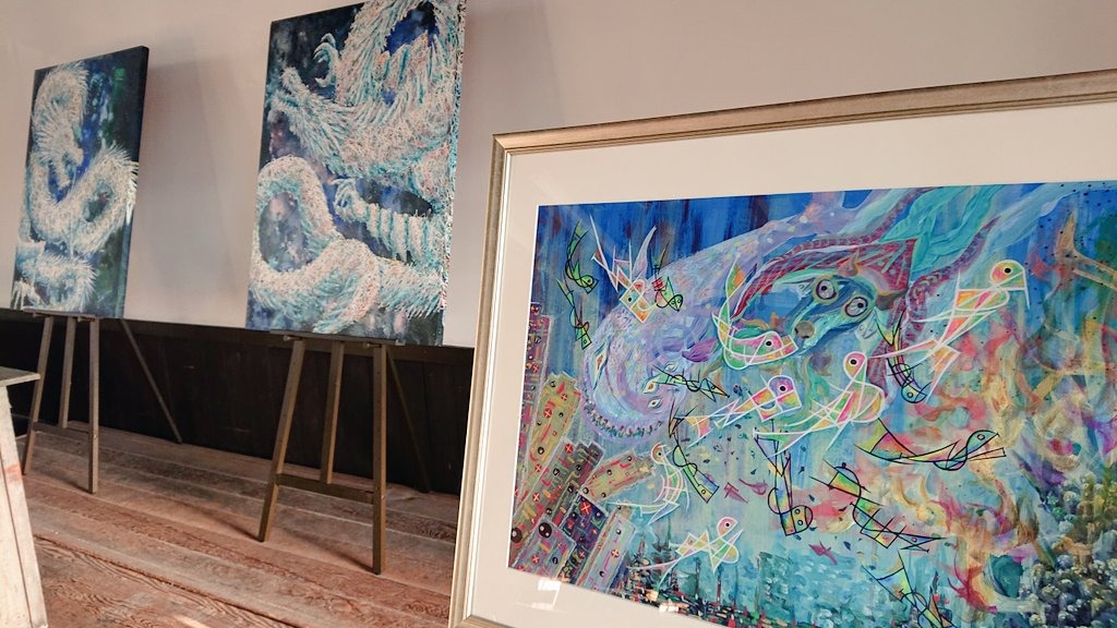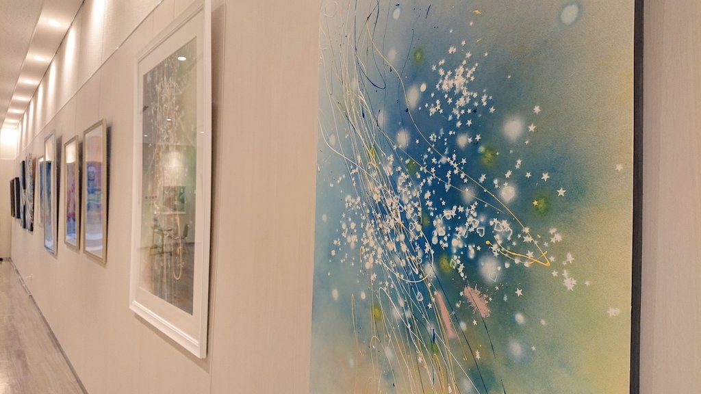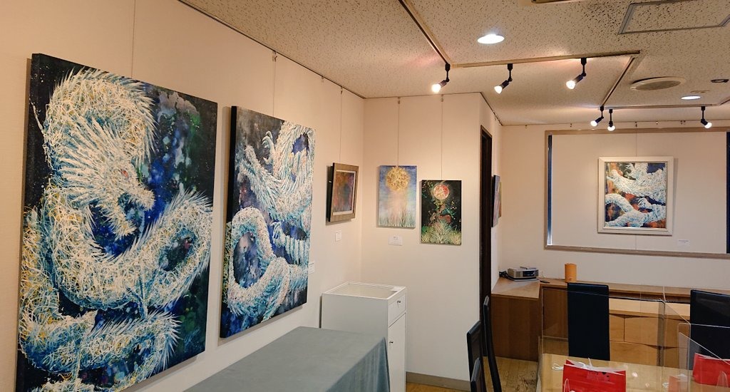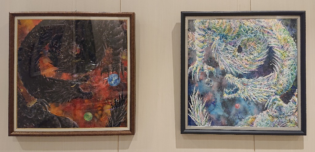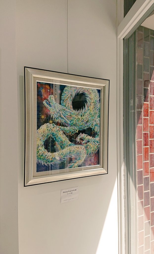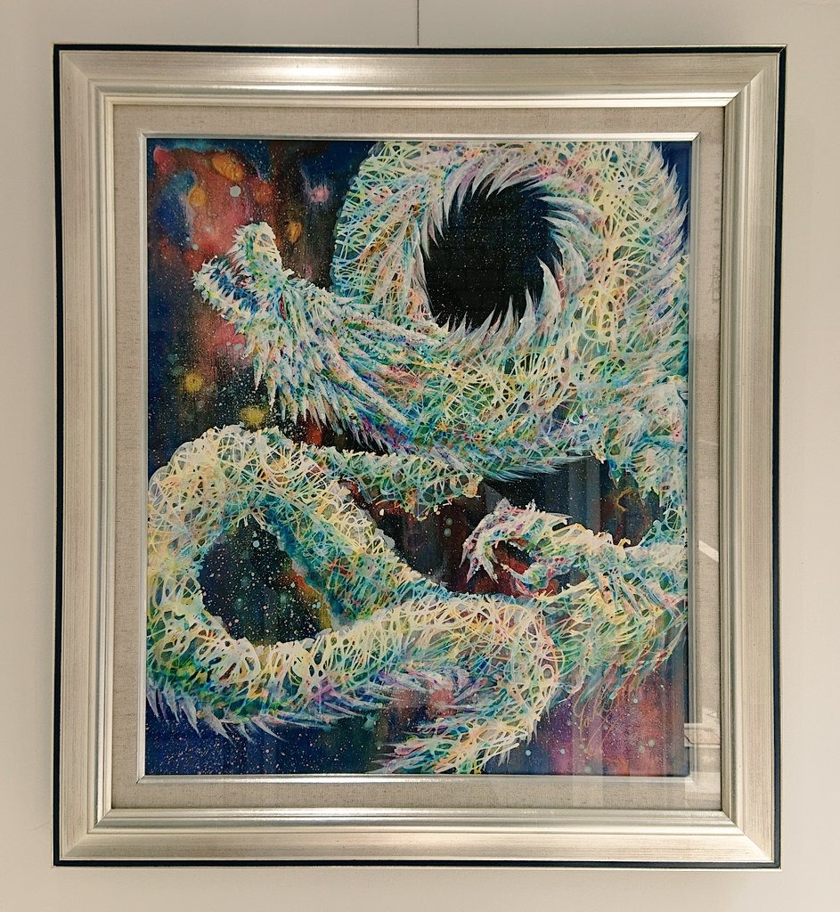 故郷である岩手県の、岩泉町にある龍泉洞。この美しい水と通年10℃前後の安定した気温に恵まれた鍾乳洞は、古来より「龍が居た空間」という伝説がありました。その龍泉洞の「天に上り光り輝いた」とされる龍を表したのが、《Shining Brightly(龍泉)》です。これを表した背景には、「創作活動を10年超え培った技術や考え」を次のステップでどう生かすか…という思いがありました。身近に存在する、龍の伝説。しかし、簡単には出来ませんでした。テーマとしてあまりにも王道な龍を表すとなると、おいそれとはできない何かが、自分の中にはあったからです。現在の表現に至る前に古今東西の龍を3週間で100枚描き、中国の龍の由来等も調べ、他の動物の骨格や筋肉等も研究し、やっと造り上げました。その思いや鍛練の成果を、「アクリルの可能性の追求」というテーマの元編み出した表現方法とリンクさせることで、独自の龍神を表すことができたと感じています。近年では、「龍泉洞の龍」からさらに発展し、人々の想いを受け止め様々な龍神として具現化させています。「地球を浄化する虹色の龍」である《Shining Brightly(虹龍)》や、「人々を守る火の龍神」というイメージの《黒龍 軻遇突智》等は、正にその例と言えるでしょう。