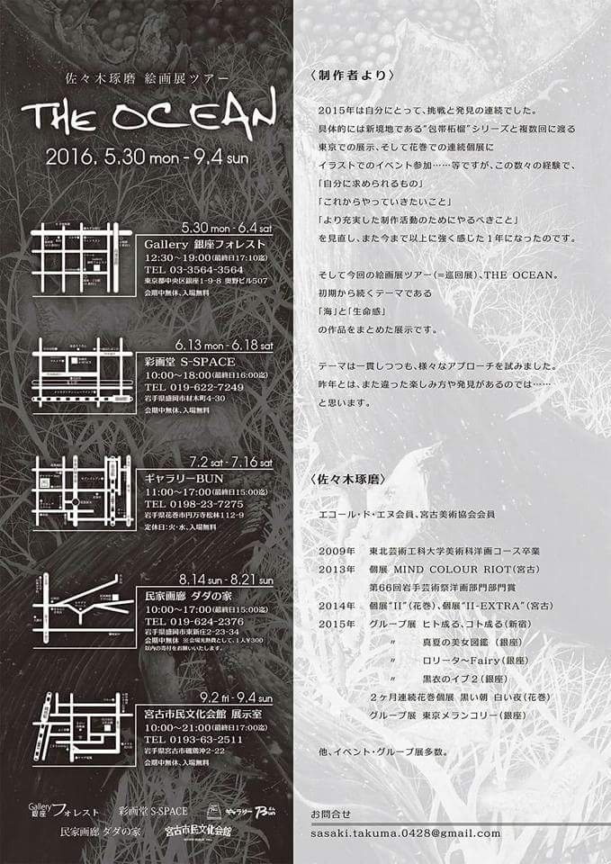 佐々木琢磨 絵画展ツアー THE OCEAN(振替)2016/11/11(金)~11/13(日)10:00~21:00(※最終日17:00まで)宮古市民文化会館 展示室TEL:0193-63-2511岩手県宮古市磯鶏沖2-22入場無料
